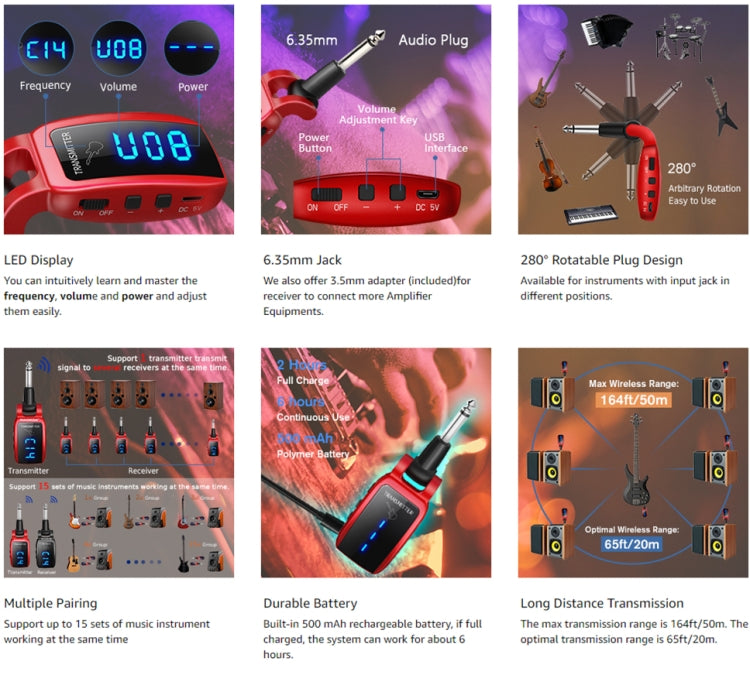 U12DX 6.35mm Jack Wireless Guitar Transmitter Receiver Rechargeable Adapter(Red)
