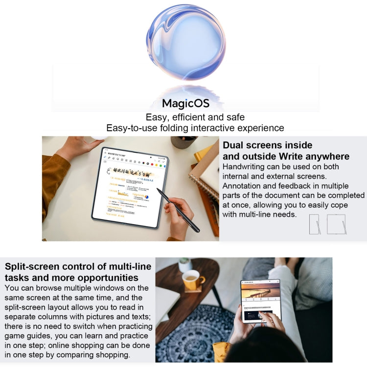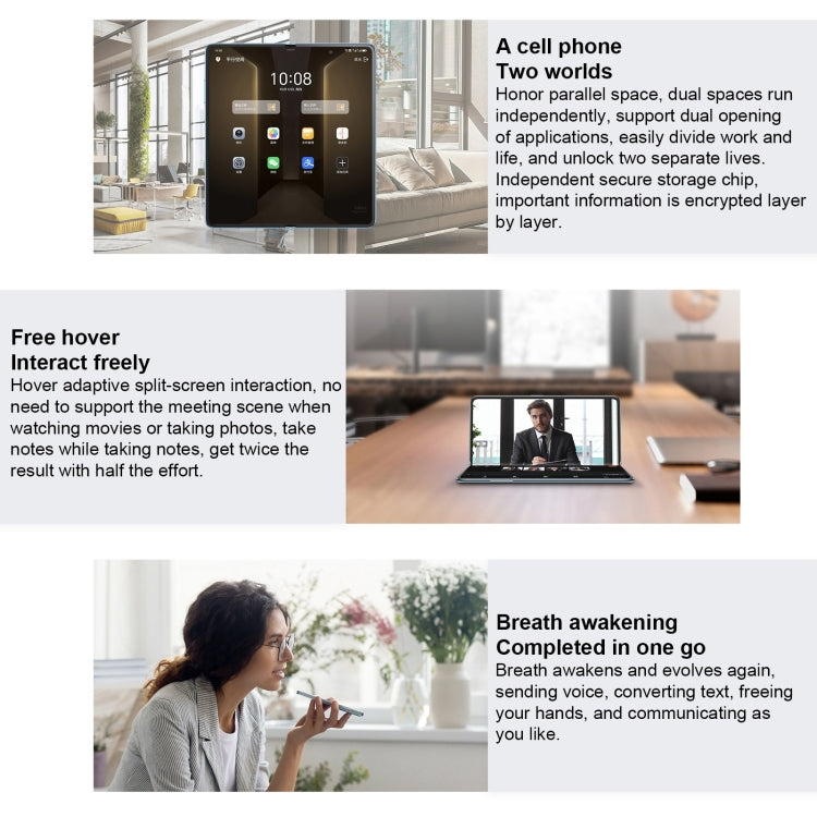 9. Featured functions: Parallel space, Honor document, global annotation, breath wake-up text input, phone cloning, business card scanning, smart multi-window, YOYO smart voice, smart vision, smart screen recognition, AI subtitles, payment protection center, application lock , application clone, password safe, backup and recovery, service repair mode, dark mode, e-book mode, YOYO suggestions, smart split screen, smart interconnection, Magic text, sleep aid display, natural light-like eye protection, breath wake-up, privacy month Newspaper, one-click blockbuster, glory editing, glory notes, global collection