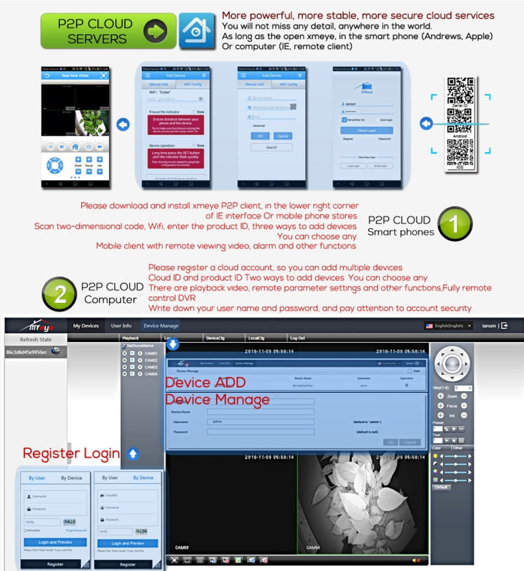 2. Step on the Internet: With cloud service, easy to achieve a variety of network penetrations, one step to remote monitoring, getting rid of various complicated network settings, easy and simple to operate.