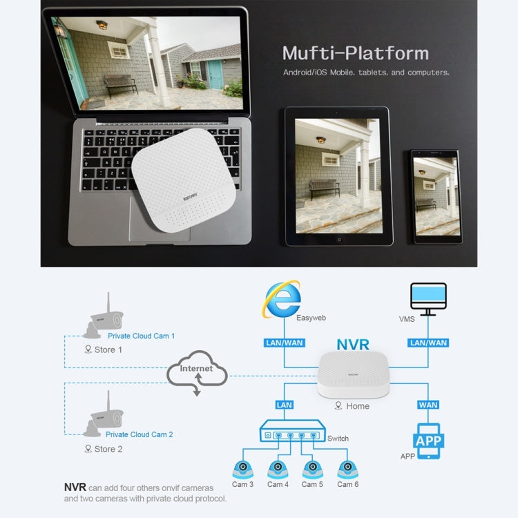 2. Support Max.6ch preview, 4ch playback; Add 2ch cloud channel can add ESCAM IP camera with private protocol remotely.