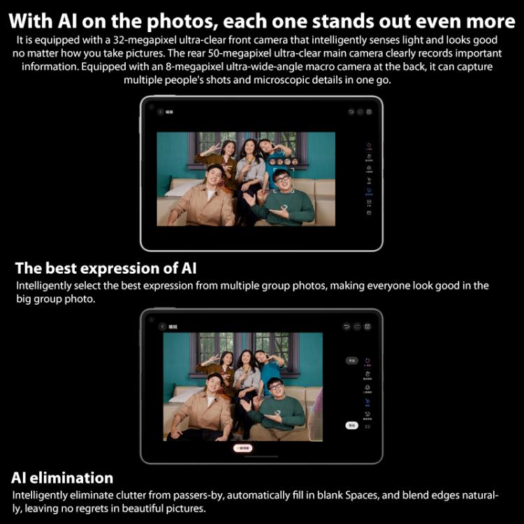 9. Rear camera: 50MP (f/1.8 aperture), + 8MP wide-angle (f/2.2 aperture), supports auto-focus, support up to 8192x6144 pixel photos, 4K video recording. Shooting functions: Time-lapse photography, high-pixel photography, slow motion, large aperture, panorama, voice-activated photography, timed photography, skin beautification, wide angle, professional mode, P3 photography, 4K video recording, etc.