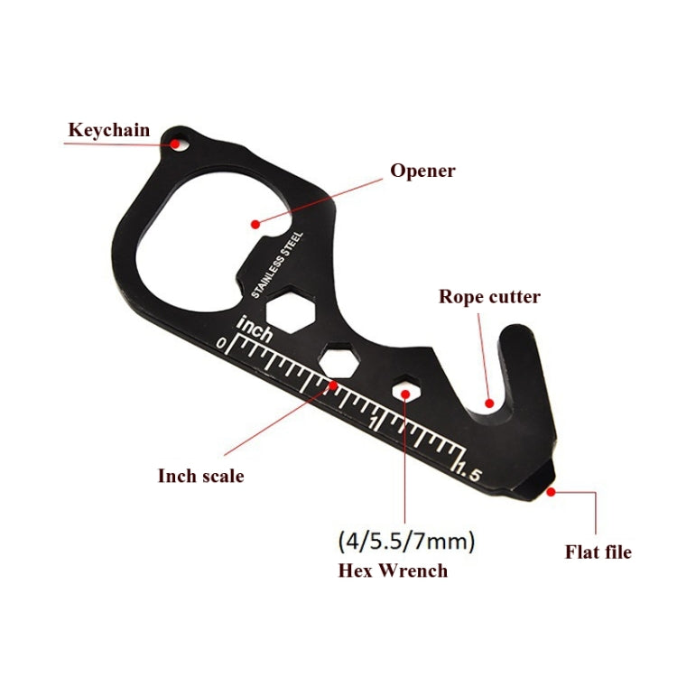 6. Function: keychain/bottle opener/rope cutter/inch scale/(4/5.5/7mm) flat file/hex wrench