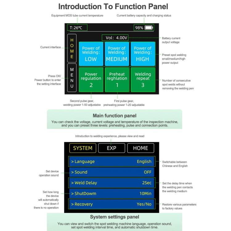 6. System settings panel: View and switch the spot welding machine language, operation sound, set the spot welding interval time, and automatic shutdown time