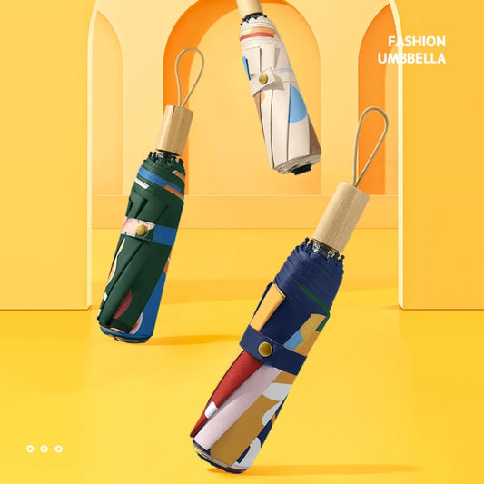 3-fold 16-bone Hand Open Umbrella Retro Wood Handle Black Glue Sunshade Umbrella(Spring Tree)
