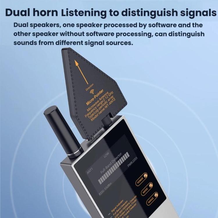 3. Bidirectional antenna, when the antenna points to the signal source, the sound is stronger, and 0.1-12G signal source can be detected